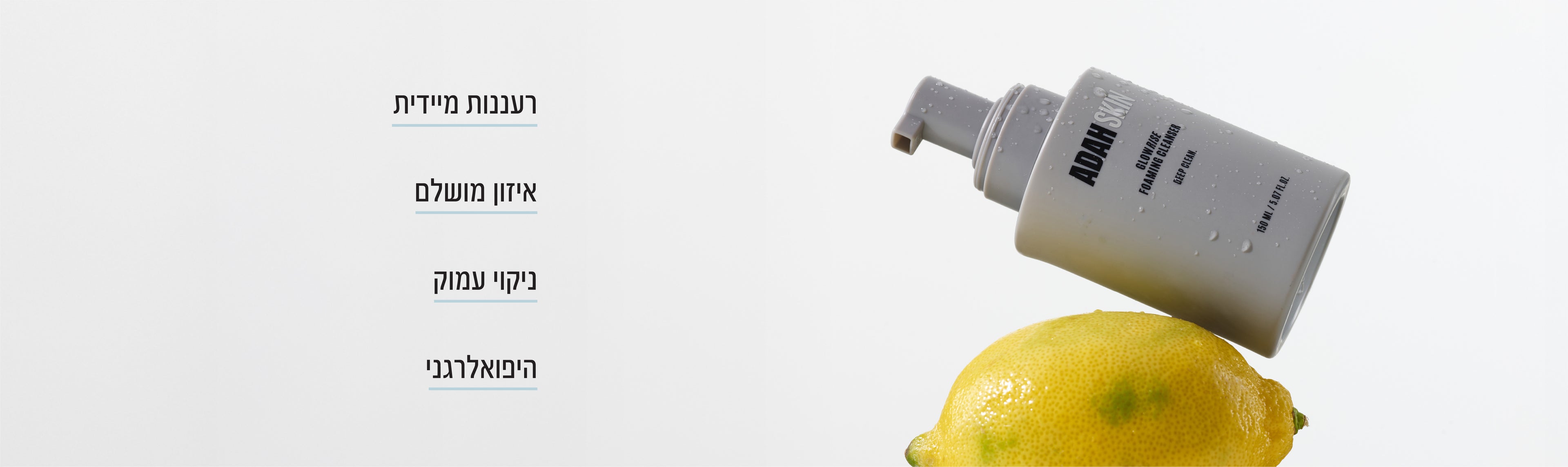 נבדק קלינית לעור רגיש, היפואלרגני ומתאים לכל סוגי העור, טבעוני , ללא גלוטן, ללא ניסויים בבע״ח, ADAH SKIN CLEAN